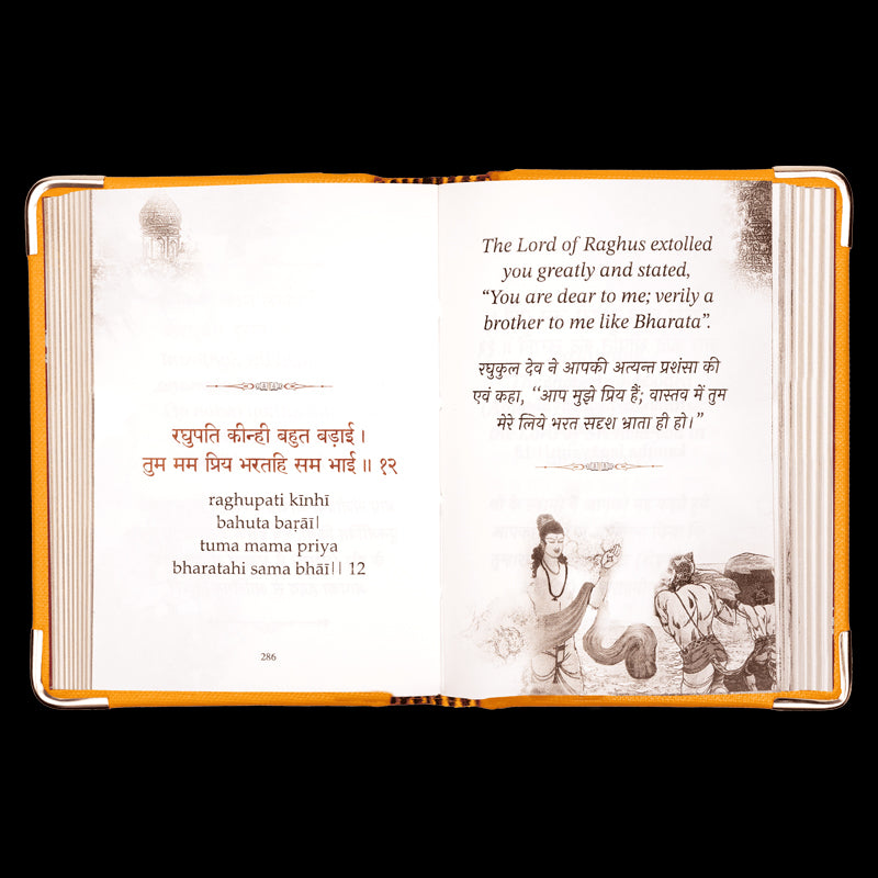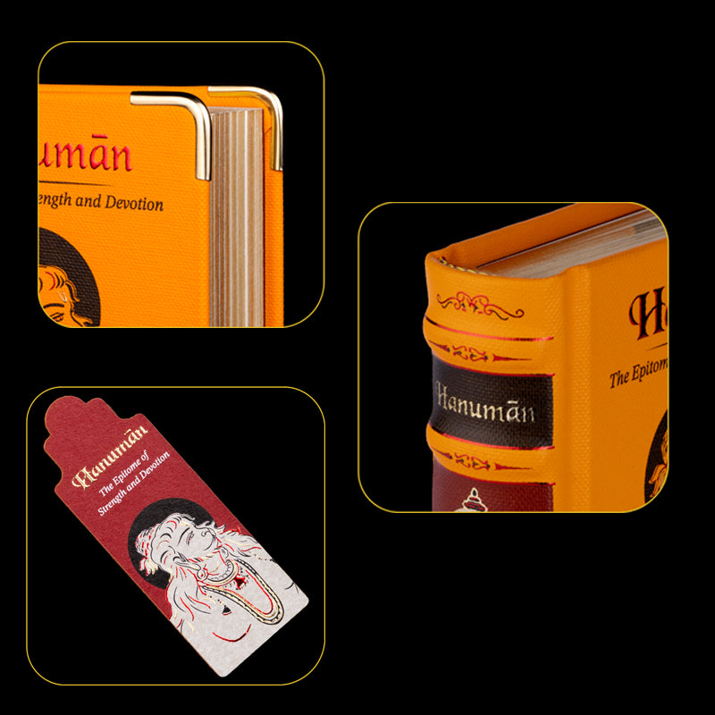 Terwijl je de omslag opent, vormen de pagina’s zich tot een pad van devotie. De verzen staan in het originele Awadhi, met Engelse transliteratie én vertaling in zowel het Engels als Hindi. Je ontvangt een delicate bladwijzer met een afbeelding van Lord Hanuman om je reis door het boek te begeleiden.