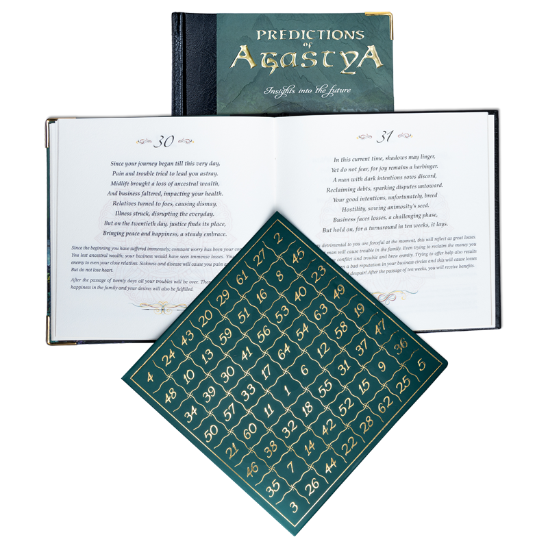 Stap in de wereld van de oude wijsheid met Predictions of Agastya, een spiritueel hulpmiddel dat de tijdloze inzichten van de grote wijze Agastya naar moderne zoekers brengt. Deze unieke kit biedt een blik op je toekomstige pad, met begeleiding op het gebied van gezondheid, rijkdom, relaties en spirituele groei.