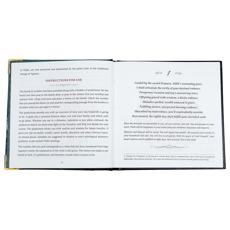 Het gebruik van deze set is een ritueel van inzicht en verbinding. Het boek bevat de vertaalde verzen van Agastya, elk rijk aan voorspellingen en wijsheid over levensgebieden zoals gezondheid, relaties, rijkdom en spirituele groei.
