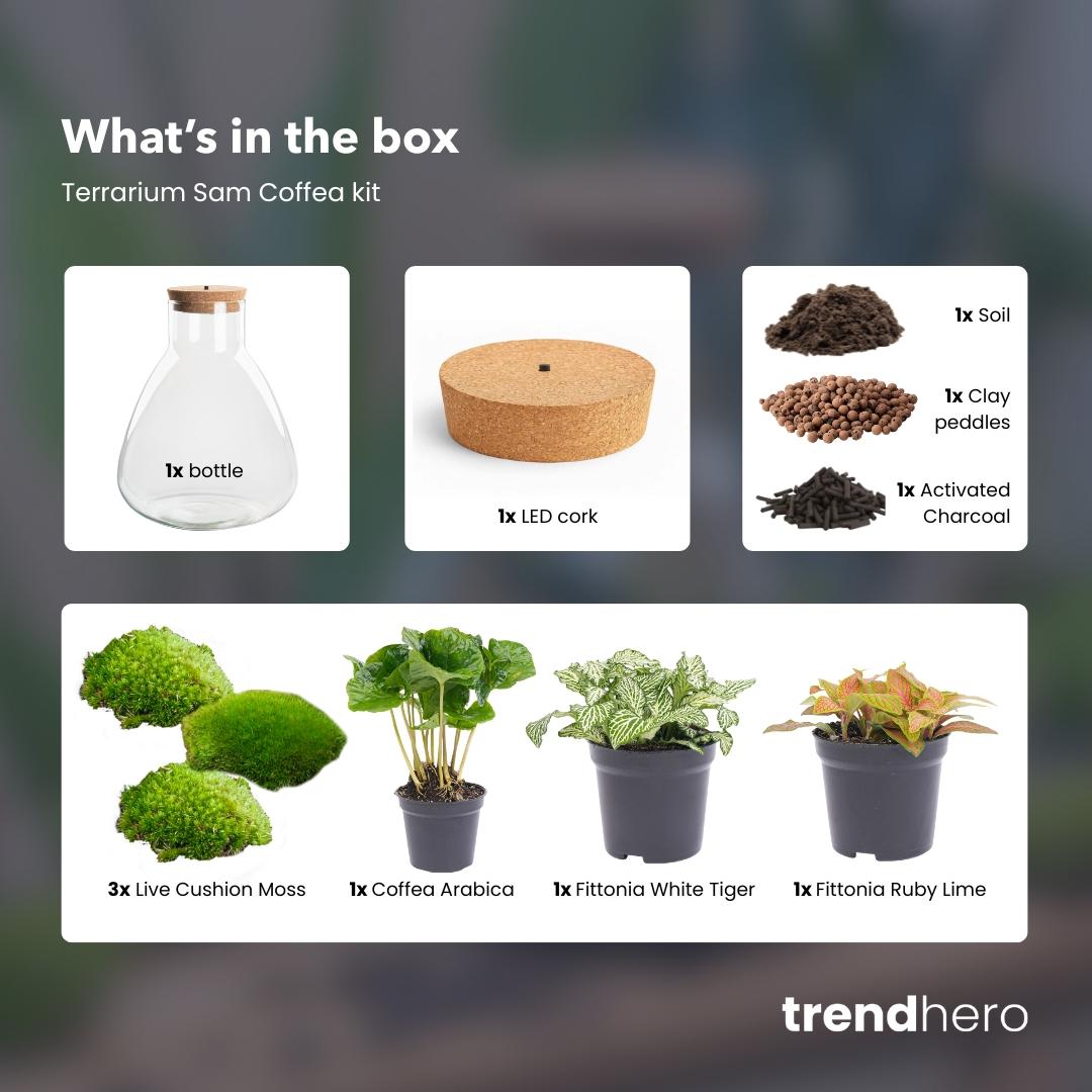 Terrariumplanten: Coffea Arabica, Fittonia Ruby Lime, Fittonia White Tiger