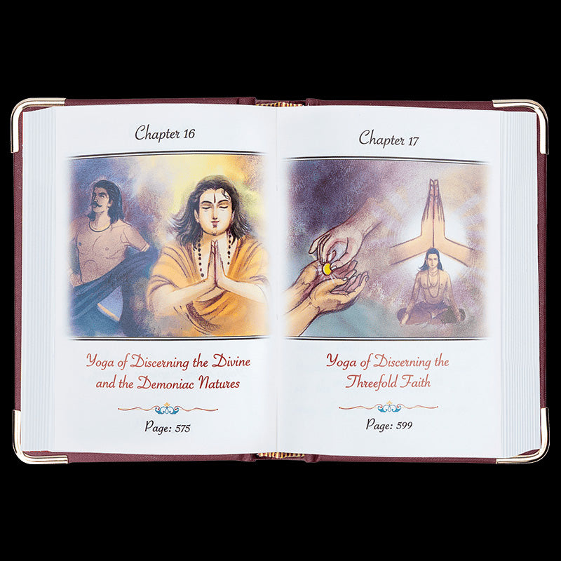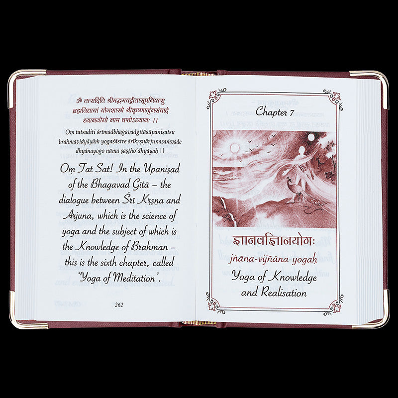 Met een stevig hardcover in formaat A7 en luxe afwerking – stoffen kaft, subtiele foliedruk, gouden accenten en een metalen bladwijzer met afbeelding van Krishna – brengt deze editie zowel inhoudelijke diepgang als visuele schoonheid. De oorspronkelijke Sanskrit-verzen, transliteratie en Engelse vertaling zijn opgenomen zodat zowel beginners als gevorderde lezers kunnen verdiepen.