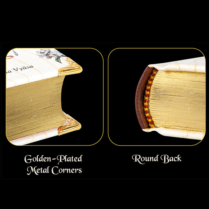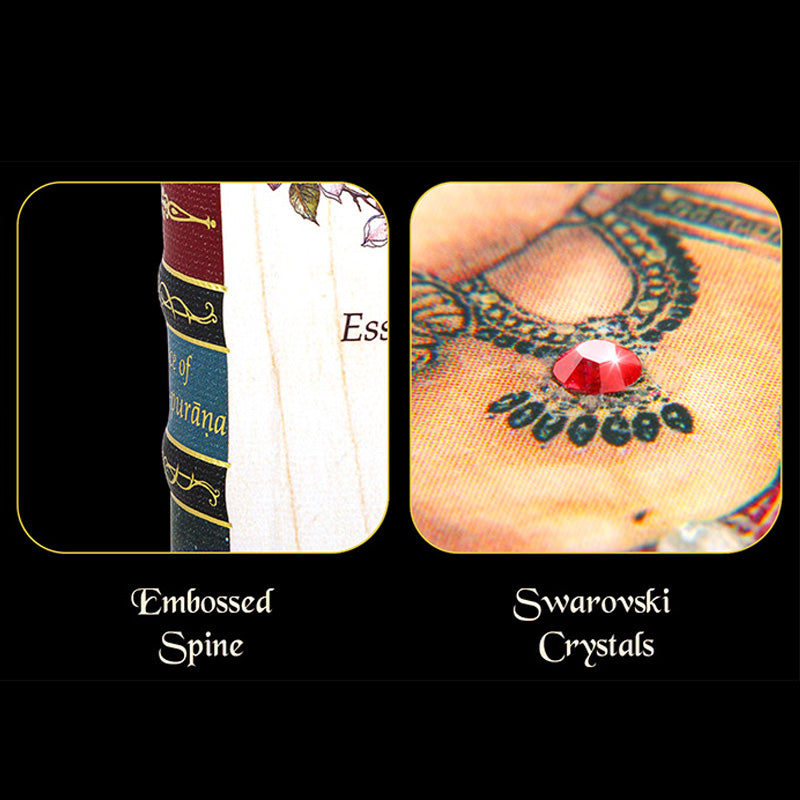 Elke keer dat je de doos opent, voel je de vruchtbare stilte van een heilige ruimte. De illustraties, foliedruk, embossing, Swarovski-accenten en vergulde metalen hoeken brengen het verhaal tot leven. De metalen bladwijzer en elegante kaft versterken de ceremonie van lezen. Dit is een object dat zowel schoonheid als betekenis combineert.