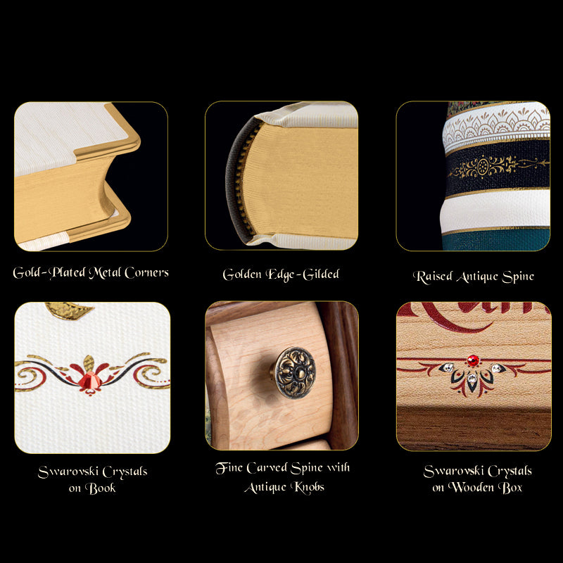 Elke bladzijde is gedrukt op duurzaam FSC-gecertificeerd, zuurvrij papier met plantaardige inkten. De boeken zijn afgewerkt met gouden randen, metalen hoeken en kristallen details. Luxe stoffen omslagen, reliëfdruk en verfijnde foiling maken van dit werk een waar kunstobject.